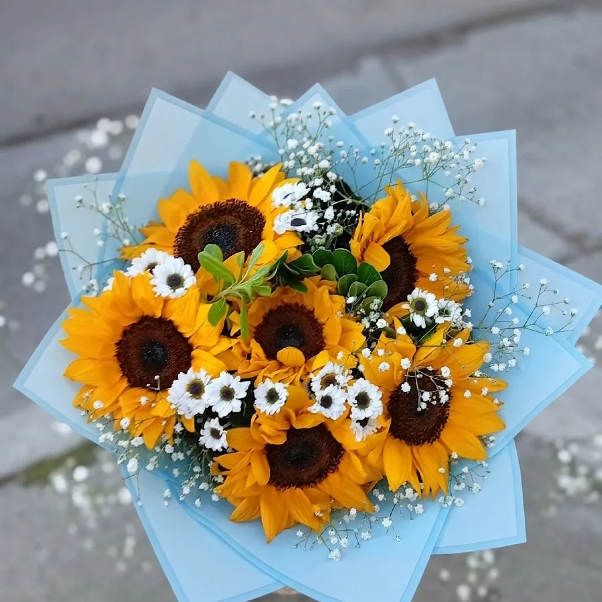 RAMO MEDIANDO 6 GIRASOLES MAS FOLLAJE VERDE Y BLANCO DE TEMPORADA