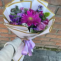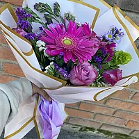 ✨ Deleita los sentidos con este exquisito arreglo floral en tonalidades moradas, símbolo de refinamiento y admiración. 💐 Combinación perfecta de gerbera, rosas y estares, cada tallo seleccionado meticulosamente para crear una obra de arte natural.